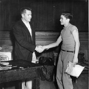 "Edward McGivern presenting prize to Jonnie De Vol, second place winner of yo-yo contest, 1954."