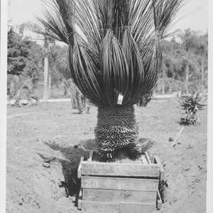 A photograph mounted on a black page with the label "Dasylirion longissima, N. C-22." The plant pictured awaits planting in its new home in the desert garden. The label that accompanies this photo in the album reads "Dasylirion longissima, N. C-22."