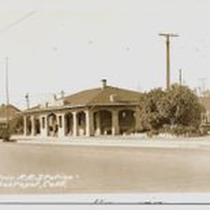 Postcard--black and white photo: The Petaluma & Santa Rosa Railway (P&SR) Sebastopol Depot circa 1920. The handwritten caption states: "Electric R.R. Station--Sebastopol, Calif." The depot station was built in 1917 by architect Brainard Jones of Petaluma. It has a ten-foot-wide covered passage that encircles the building and stone piers built with rock from the Stony Point Quarry. In 1966 the Depot was placed on the National Register of Historic Places.