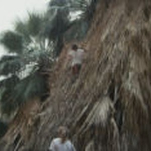 Female student slides down dried fan palms while another student watches at the Thousand Palms Oasis, along the San Andreas fault.