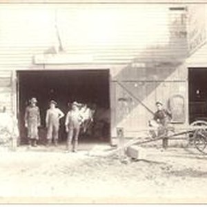 Photo--black and white: C T Snow Blacksmith business about 1900 in Sebastopol on Petaluma Avenue. Clark Tabor Snow (1855-1940) owner is man in bowler hat (third from left). At far right is Snow's son Wilbur Worth Snow. Sign states "General Blacksmithing."