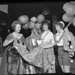 SERIES of five photographs taken for the Retail Merchants Assocation to promote their Downtown Days celebration. The merchants had models and windows displays in Hawaiin theme because they were giving away a trip in Hawaii on the S.S. Lurline a ship of the Matson Lines.