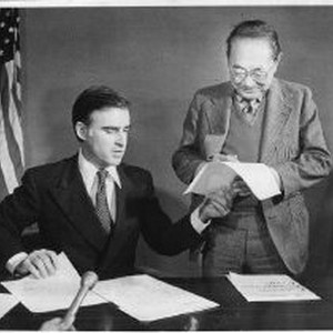 Dr. S.I. Hayakawa, standing, with Gov. Jerry Brown. Brown was signing a certifate appointing Hayakawa to replace Sen. John V. Tunney, who resigned early to give Hayakwa extra seniority. Hayakawa was an English professor at San Francisco State U. from 1955 to 1968, President from 1968 to 1973, President Emeritus from 1973-1977, and a California Senator from 1977 to 1983.