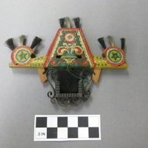 Small carved wooden object with attached metal container. Painted star pattern in red, green, blue, and white. Hair-like tufts of unknown material extend up from piece in six places. Green cord for hanging(?) and "Portugal" on reverse.
