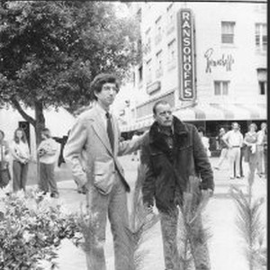 Phil Angelides introduces an unidentified man at event on the K St. Mall with musicians in background. Ransohoff's women's clothing store behind him.