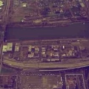 Aerial photograph looking over I-5 towards Old Sacramento and the Sacramento River.