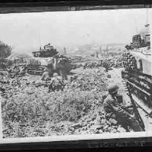 SERIES: 13 views of World War II Pacific Theater activities. This view shows two tanks in a field. Soldiers appear to be tending to the tanks.