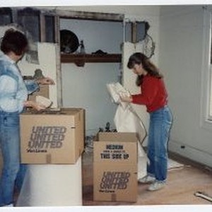 Staff packing up the artifacts from apartment #27 from the Merrium Apartments for transfer to the archives.