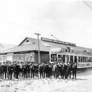 Petaluma Chamber of Commerce members at the Sebastopol Apple Growers Union packinghouse #3 with a special railroad car to Sebastopol on P&SR in connection with the Gravenstein Apple Show of 1920