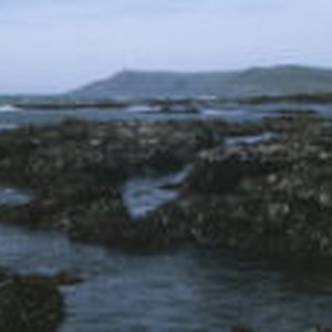 Large rocks in the foreground and a sweeping view of the mountains and coastline at Cayucos.