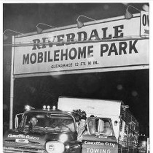 Description on back of photo states: "Massed trailers moving out of Riverdale Trailer Park just before water came in."