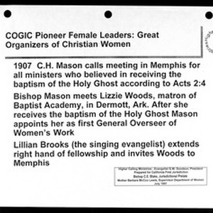 "COGIC pioneer female leaders: organizers of Christian women", paper prepared for the California first jurisdiction, Church of God in Christ, by Higher Calling Ministries, 1997 July. Copy 1. [Description English/roman)]