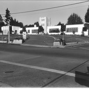 Photo, black and white: Sebastopol Parkside School in 2006. Parkside is located at 7450 Bodega Avenue between Dutton and Washington. Castle Preschool sign visible. This photo was used in the West County Museum exhibit "Sebastopol Now and Then" that opened September, 2006.