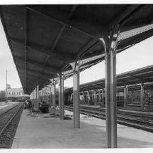 View looking east of the Southern Pacific Railroad yards. Men are seen working on the platforms next to the tracks. In the far background is a view of Station A, the power substation.