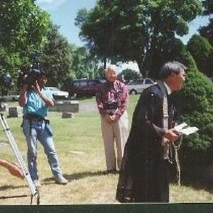 Visitation to Linkville Cemetery in Klamath Falls, Oregon: A religious priest stands close to the gravemarker while a camera crew films.