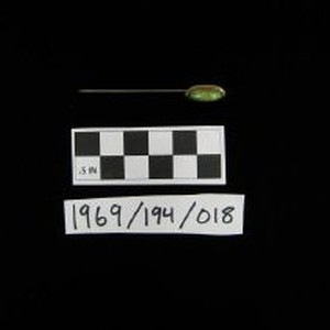 Brass stick pin with green oval-shaped stone set in brass oval attached at one end. No clasp.