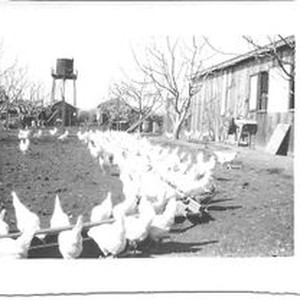 Print: black and white: Chickens at the Harry Rosebrook ranch in Sebastopol, winter 1928. A water tower is seen in the background and a barn to the right. Caption on verso: "Our chichens Winter 1928."