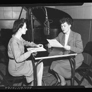 SERIES.Views of unnamed two men in front of a KFBK microphone.Also two unnamed women in front of microphone.