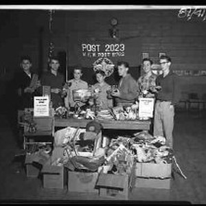 Seven unidentified teen ageds boys standing around a collection of toys under a banner reading "Post 2023 V. F. W. Post 8762" Posters on the table read "Stock-And-Stomp Teen Age Dance".