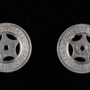 Two military identification tokens belonging to Hiroshi Sugiyama indicating his service number, enlistment in the United States Army, and station at Camp Grant, Illinois, [1941/1945].
