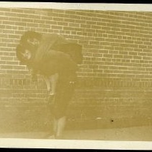 Two girls, friends of Mary Ansen, clown around. Wall of Sacramento High School behind them.