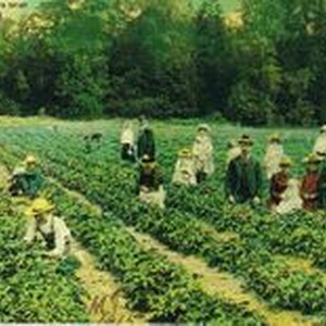 Photo--color: Picking Strawberries near Sebastopol California in 1915. The photo shows men, women and children posing for the picture as well as picking strawberries. All wear hats and most of the people wear suits and dresses.