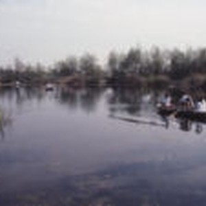 View to the southeast across pHake Lake at Bernard Field Station. Three boats of students on the lake in the distance.