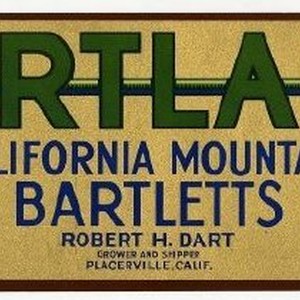 Crate label (2). Dartland California Mountain Bartletts, Robert H. Dart, grower and shipper, Placerville, Calif. Gold label, green lettering, long dart through the letters.