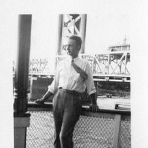 Otto leans against railing of ship. Tower Bridge visible behind him.