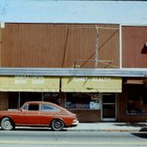 Print, color: The east side of North Main Street Sebastopol, about 1970s. Businesses seen, Medico Drugs, Tombe Realty and Sebastopol Book Store.