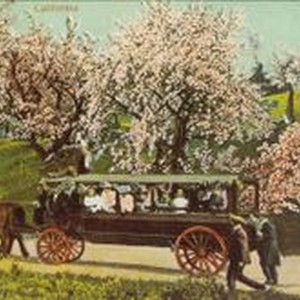 Postcard--photo--hand colored: Horse drawn bus on road next to apple orchard in bloom. Women and children in window of bus. Caption: "California." Circa 1900.