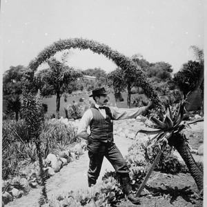 Commonly referred to as a "foxtail" agave, due to the appearance of the flower stem (inflorescence) which Hertrich is here supporting. William Hertrich was Superintendent of Botanical from 1927 to 1949. The label that accompanies this photo in the album reads "Agave attenuata."