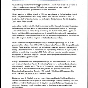 Biography flyer on Charles Handy exploring his life and work. The text indicates that Handy was born in Kildare, Ireland, and educated in England and the United States at Oriel College and MIT, respectively. It proceeds to recount his years working in industry at Shell International and for the Anglo-American Corporation, before moving on to discuss Handy's years as a professor specializing in managerial psychology, his current work, and his honorary degrees. In particular, the document concentrates on Handy's present interest in the management of change and the future of work, emphasizing his practice of upside-down thinking, and how he manages a portfolio marriage with his wife, Elizabeth Handy.