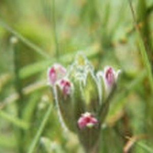 Close up of pink and white flower bud surrounded by tall grass.