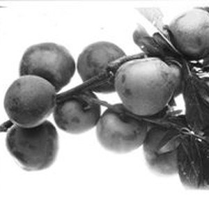 Photo, black and white: Plums on a branch. Caption on back: "Plum BB-16 E Br) July, 1929."