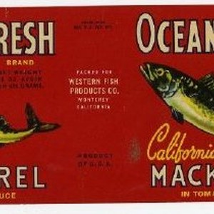 Can label. Ocean Fresh Brand California Mackerel in Tomato Sauce. Packed for Western Fish Products Co., Monterey California. Net Weight 15 oz. Fish jumping out of water on red background.