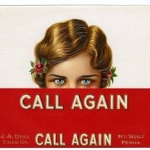 Label. Call Again Brand Inner Cigar Label. J.A. Doll Cigar Co., Mt. Wolf, Penna. Call Again Image of young woman peaking over red label