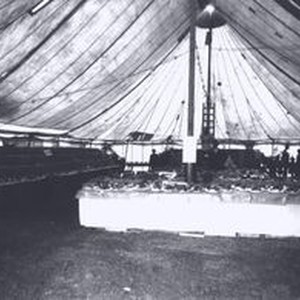 Photo--black and white, from Borba 8" x 10" celluloid negative: Gravenstein Apple Show, about 1930. Apple displays under the tent. Tables of apples with a Jonive sign visible in foreground.