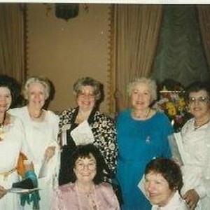 Seven women stand or sit and pose for the camera. Frances Burt stands second from the right., Vicki Lavorini stands third from the right, and Florence Wylie stands fourth from the right. The photograph is glued to a piece of paper. Next to the phtograph is written: "California North delegation, Washington 1988." Photograph removed from file folder, National Organization of the NLAPW, 2003/051/027.