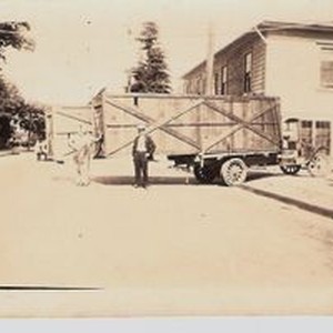 Photo--black and white- 1920 photo of plane in crate on a truck . Two men standing in front of the crate which is loaded on a truck. One of the men is most probably A. S. (Sam) Huck Sr. The McCaughey Brother, Inc. owned Sebastopol Garage, and Sam Huck, Sr. was the Manager.