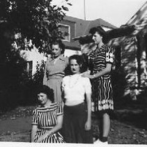Friends pose on steps in Fern Sayre's front yard. Identified as: Marcia, Fern, Maxine, Cissy. Note on back says, "Shirley gone on vacation. Marcia is only 16 yrs., good company for Cissy."