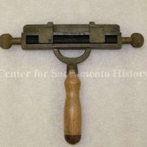 Brass tool with wooden handle and turn-screws. Used in the process of applying gold embossing to a book cover. According to donor, it is also known as a "Kensol Stamping Clamp."