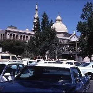View looking west along the K Street Mall from 13th Street. Reconstruction work is under way. The Cathedral of the Blessed Sacrament Catholic Church is in the background.
