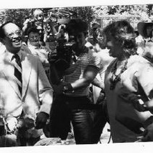 City Council representative, Thomas Chinn, presents gift of leaves to an unidentified woman. The press tapes and films the event.