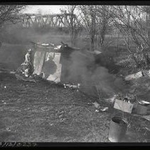 North Sacramento shack dwellers dispersed, shacks burned. Shows man in front of burning shack. 2/1/50 3 of 5