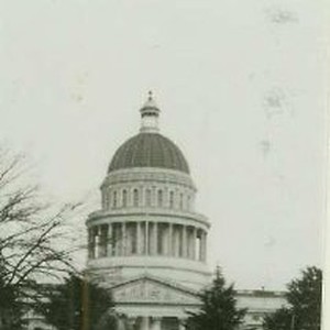 Front view of the California State Capitol building and fountain.