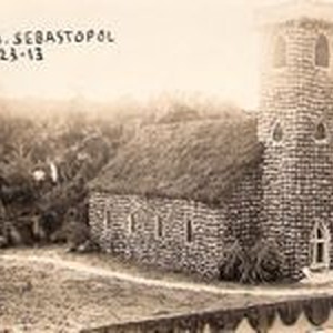 Postcard--black and white photo: Gravenstein Apple Show 1913. Display of building--possibly a church. Postcard is handwritten with "W.C.T.U. Sebastopol, Aug. 18-23-13." Women's Christian Temperance Union.