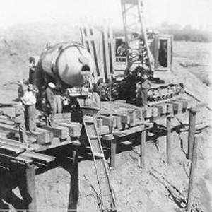 View of cement truck "pouring the tremie concrete seal in caisson No.2."