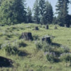 A scene of clumps of iris flowers and tree trunks near Mount Hood.