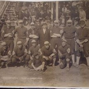 Photo--black and white: Team picture of 1915 Sebastopol Champion baseball team. Note apple insignia on sleeves of uniforms. L to R: Ray Kremer (P), Tammy Smith (LF), Artie Benham (P), Joe Thomas (Mgr), Monet Phyle (1B), Tom Cunningham (C.) Walter Cartwright (3B), Joe Tobin(CF) Bert Delmas (SS) Toots Bankhead (RF), Tommie Scanlon (2B), Johnnie Wulfi (UT) utility player, Cheeney (Mascot).